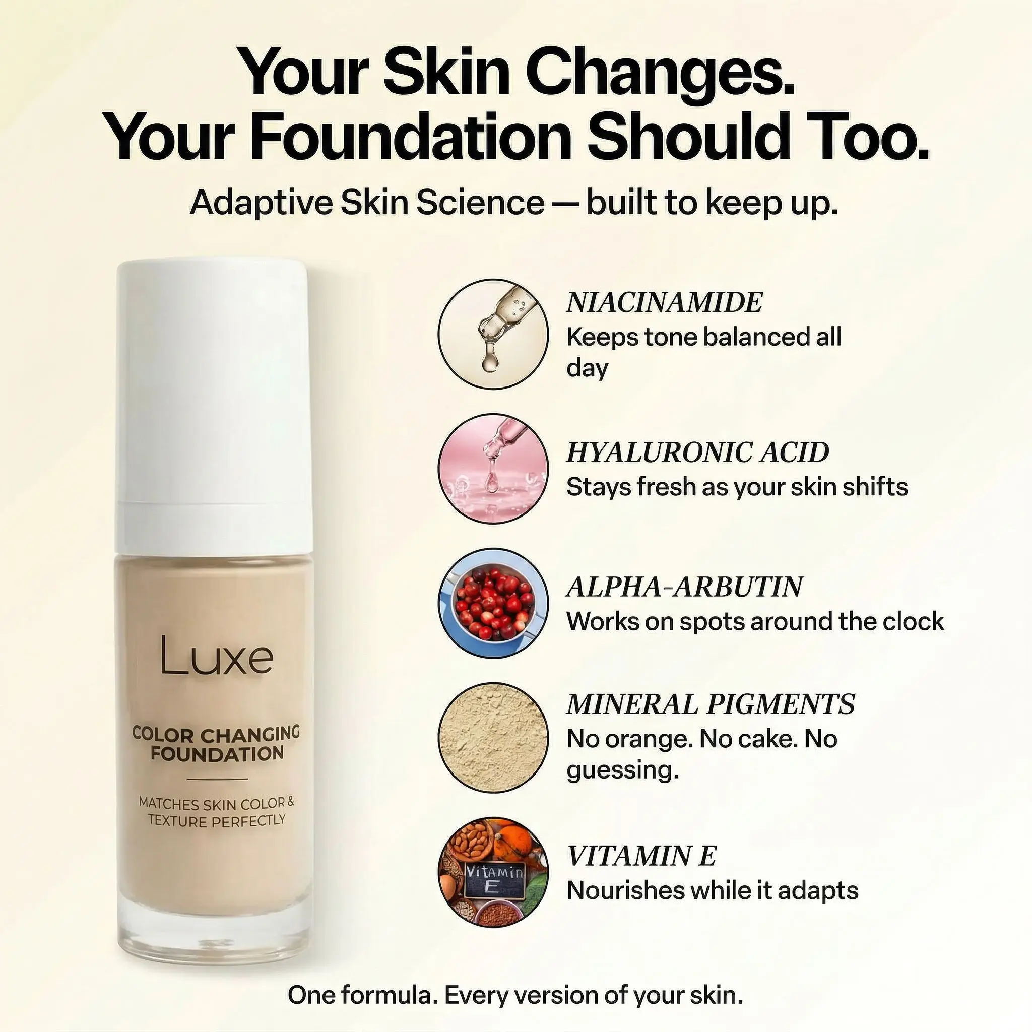 pH-Adaptive — reads your skin chemistry and adjusts throughout the day. No oxidizing. No orange. No gray.
