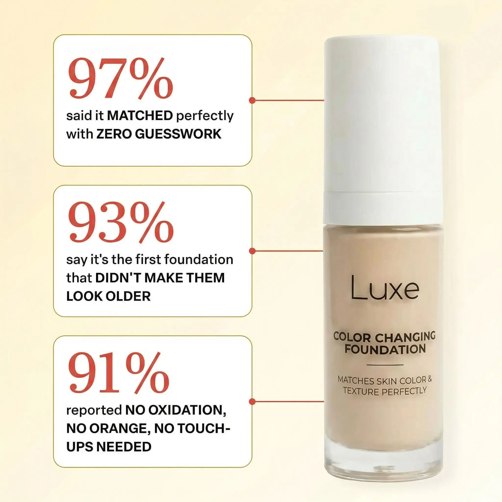 Dermatologists confirm that sun exposure causes up to 90% of visible aging. This foundation contains SPF that shields the skin from harmful UV rays. You aren't just covering imperfections - you're actively preventing new wrinkles and dark spots from forming.
