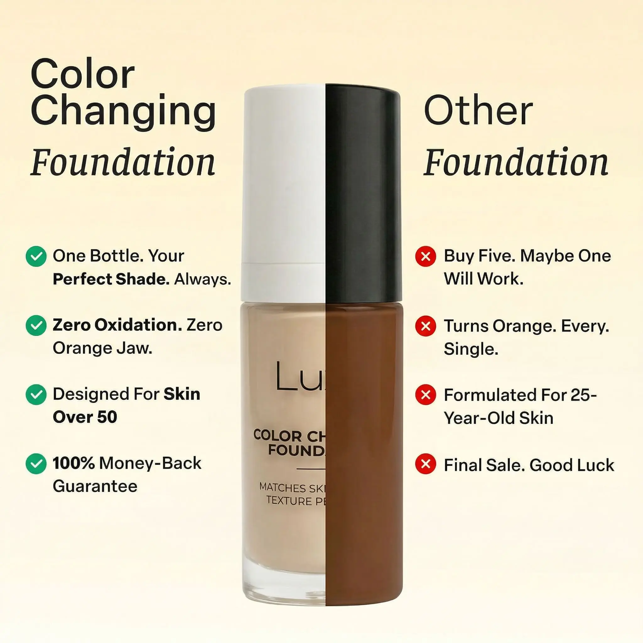 Yes, through pH-responsive microbead technology that reacts to your skin's unique chemistry. You'll see the white formula transform to your shade in 30 seconds, with perfect matching in 2-3 minutes. Unlike cheaper alternatives that use basic tints, our research-lab formula creates thousands of shade variations. 30-day guarantee if it doesn't match perfectly.